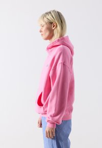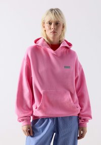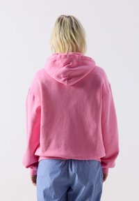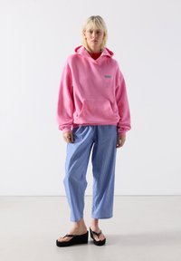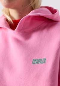 Naine kannab üle suuruse heledat roosat kapuutsiga dressipluusi, millel on ees tasku ja tekst "American Vintage", ning lahtisi sinise ja valge triibulisi pükse valge tausta ees.