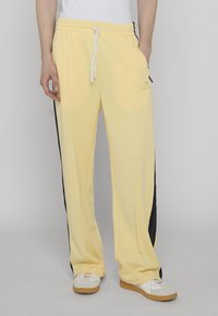 Alakeha seljas kahvatukollased jooksupüksid musta küljeribaga, valge nööriga ja valged tennised kummipõhjadega hallil põrandal.