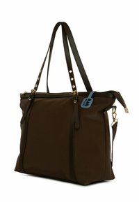 Pruun õlakott, mis on valmistatud siledast materjalist, kahe käepideme ja eemaldatava rihmaga, lukuga sulgumise ja väikese sinise sildiga.