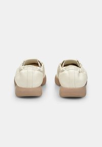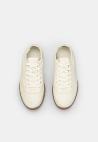 Valged nahast tossud ümarate ninaosade, paelaknööpide ja elastse kraega. Tan-värvi tekstureeritud kummist tald. Minimalistlik disain.