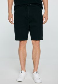 Tumed lühikesed püksid pehmest kangast, millel on paelaga vöökoht, ees taskud ja põlvetasemel lõige, kombineeritud sportlike kingadega.