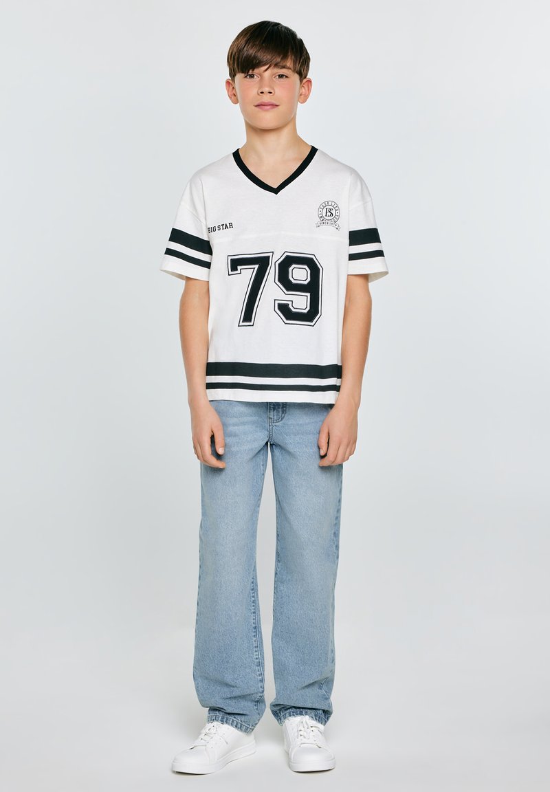 Poiss seisab, kandes valget spordistiilis T-särki numbriga 79, helesiniseid teksapükse ja valgeid tossusid, taust on ühevärviline.