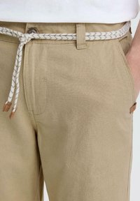 Mees, kes kannab beežist põlvini ulatuvaid lühikesi pükse, valge punutud vöö ja heledatepruunide sussidega, tavalise taustaga.