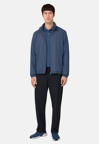 Tumesinine kerge jope, millel on struktureeritud krae, elastsed mansetid ja pahem. Sile tekstuur, minimaalne detailirohkus ning tagaküljel logo patch.
