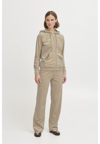 Naine seisab seljas beež värvi lukuga kapuutsiga jakk ja sobivad püksid ning mustad baleriinikingad, taust on hele ja ühtlane.