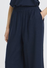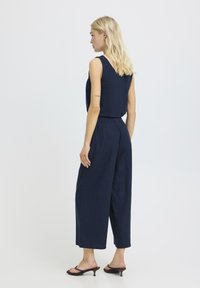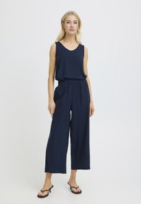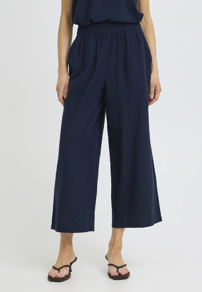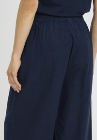 Naine, kes kannab tumesiniseid laia säärega poolpükse, millel on elastne vöökoht, ning musti kontsakingi, seisab ühevärvilise heleda tausta ees.