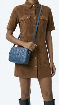 Naine, kes kannab pruunist seemisnahast nööbitavat kleiti, musti põlveni ulatuvaid saapaid, musta baretti, kuldseid rõngaskõrvarõngaid ja sinist tikandiga õlakotti, seisab valge tausta ees.