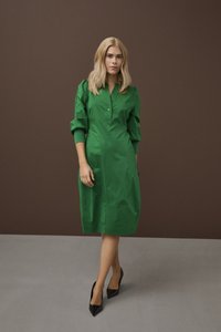 Naine blondide juustega, kes kannab rohelise värvi pika varrukaga midi-kleiti ja musti kõrge kontsaga kingi, seisab pruunil ja hallil taustal.