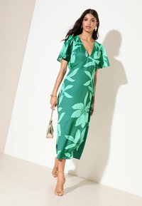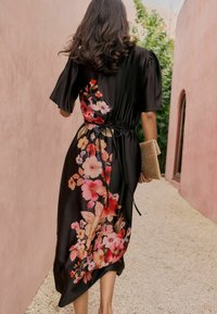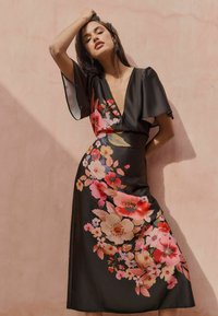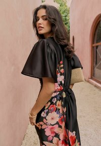 Naine kannab musta midi pikkusega kleiti, millel on lehvivad varrukad ja diagonaalne lillemotiiv roosades, punastes ja kreemjas toonides, kombineeritud beežide kontsadega.