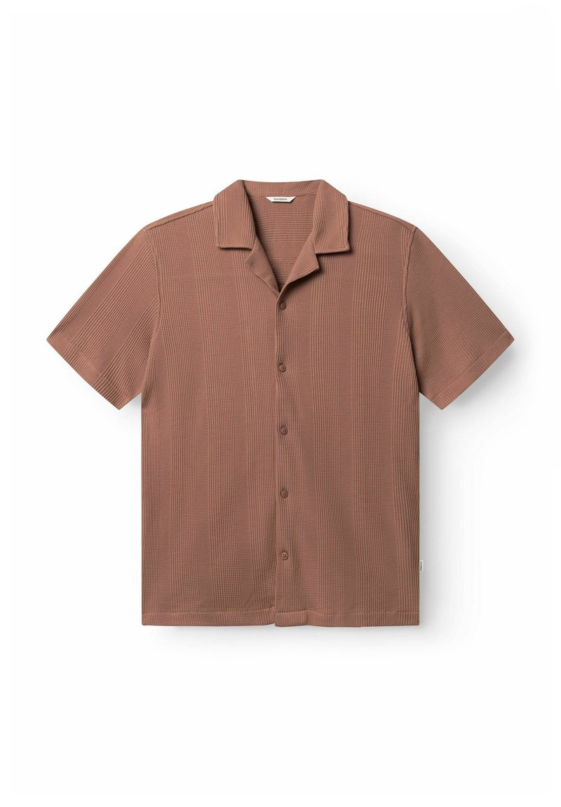 Lühikeste varrukatega särk tuhmunud roosakas toonis, millel on tekstuuriga kangas, lihtne krae ja ees kuue nupuga kinnitusega.