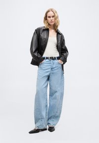 Must have mustrekäistega must pikkade varrukatega topp, millel on pitsist äär ja mis on kombineeritud tumehallide sirgete jalgadega teksadega ning mustade libisemisjalanikega, hoides helesinist käekotti.