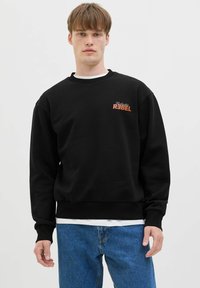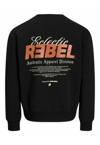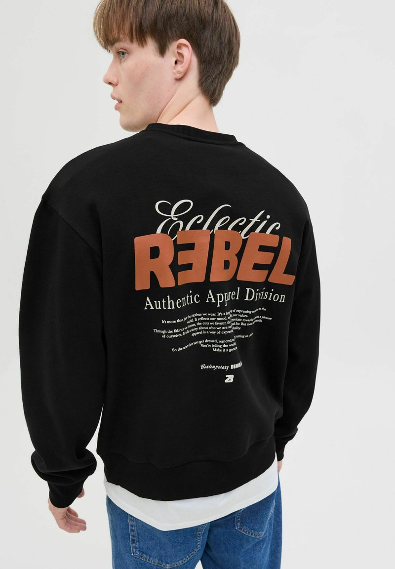 Noor mees, kes kannab musta pusa, mille seljal on suur kiri "REBEL" ja väiksem tekst "Eclectic Authentic Apparel Division", sobitatud siniste teksapükstega.