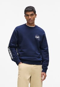 Tumesinine pusa, millel on taga multikategelase graafika, ümara kaelusega ning soonikkoes mansettide ja äärega. Varruka peal on tekst, mis lisab detaili.