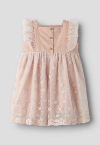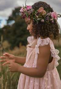 Noor tüdruk roosas pitskleidis ja lillekroon peas hoiab käes metsikut rohtu, seisab rohumaal pilvise taeva all.