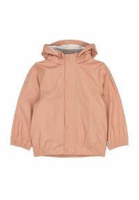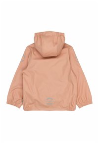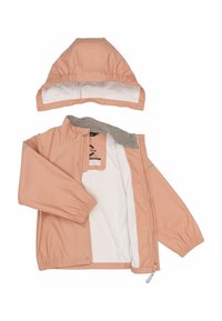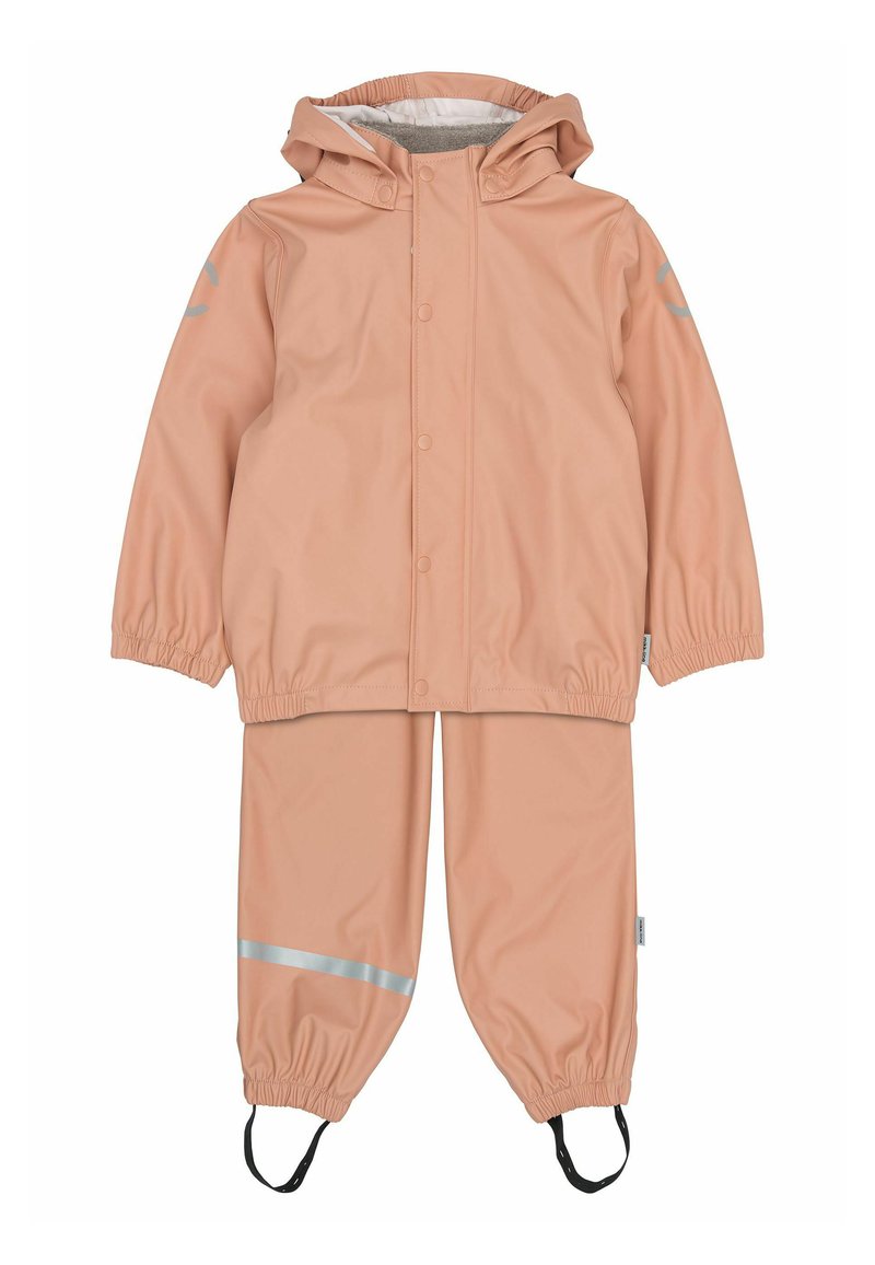 Laste veekindel kaheosaline vihmakomplekt virsikuvärvi, kapuutsiga jakk, ees trukid, elastsed mansetid, helkurtriibud ja jalarihmasid pükstel.