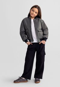 Noor tüdruk, kellel on pikad pruunid juuksed, seljas must bomber-jakk, valge t-särk, mustad cargo-püksid ja mustad litritega tossud, seisab käed taskutes.