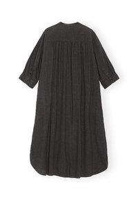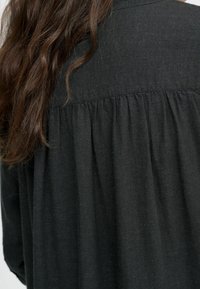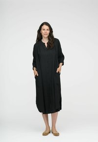 Naine seisab käed taskus, kandes pikka musta nööpidega kleiti ja beežikaid baleriinjalatseid, taustal tavaline valge sein.