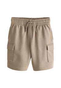 Sinised cargo lühikesed püksid, mis on valmistatud pehmest tekstuuriga kangast, elastse vöökoha ja paelaga ning kahe külgtaskuga.