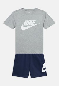 Heled sinine Nike lühikeste varrukatega t-särk suure valge logoga; kombineeritud sobivate lühktradega, millel on küljetaskud ja logo aktsendid.