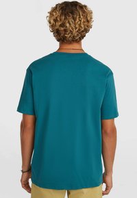 Türkiissinine puuvillane T-särk ümmarguse kaelusega ja lühikeste varrukatega; vasakul rinnal väike graafiline trükk. Sile tekstuur.