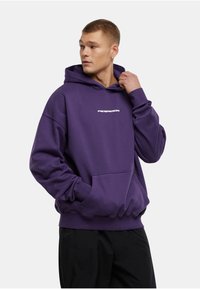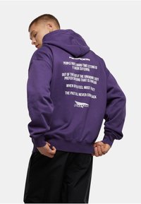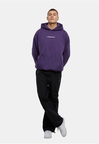 Noor mees, kellel on seljas lilla Pegadori kapuutsiga dressipluus esitaskuga ja mustad püksid, seisab üksjagu helehallil taustal.