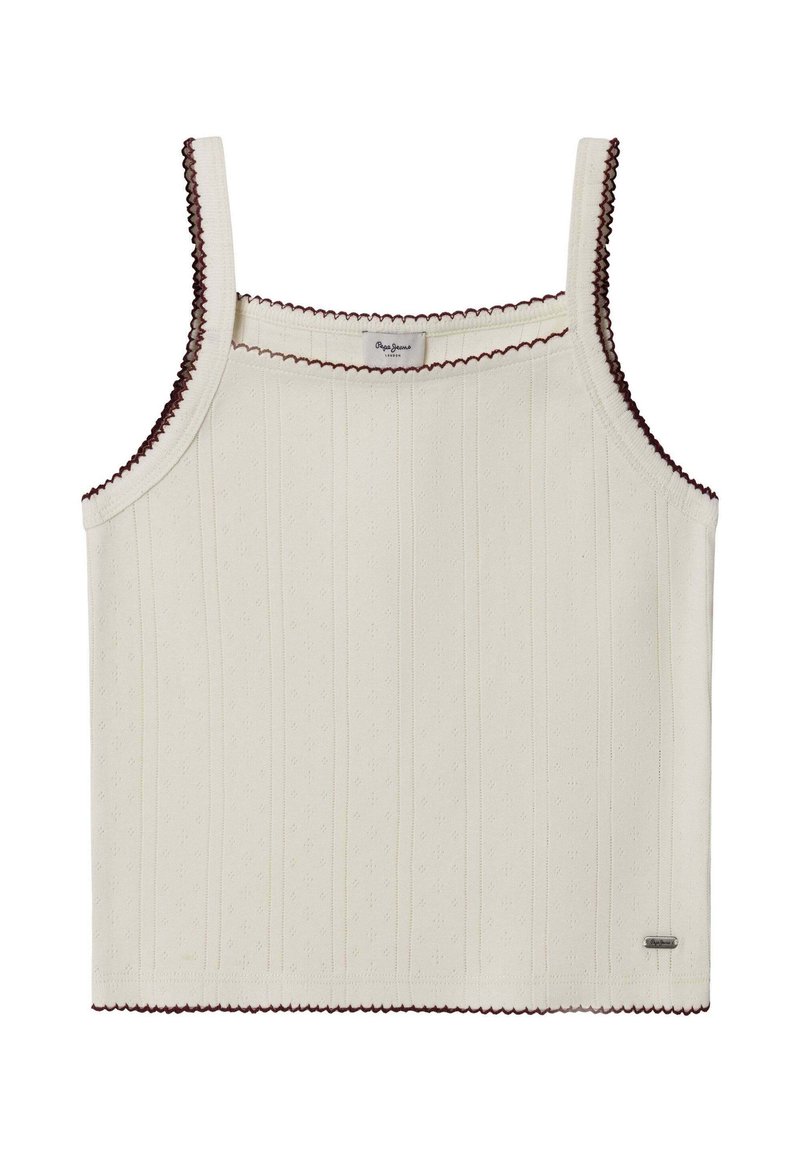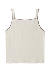 Kreemikas top õhukeste rihmadega, tekstuurse kangaga, vertikaalsete soontega ning tumepunase lainelise äärisega kaelusel ja servadel.