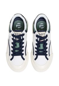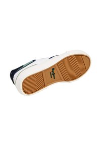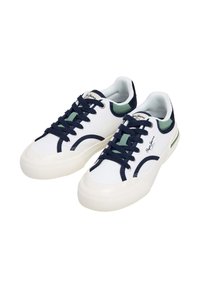 Valge kangast toss, millel on sinised aktsendid, rohelised üksikasjad, ümmargune varvas, kummist tallad ning bränding külgedel ja keelega. Loodud sinised paelad.