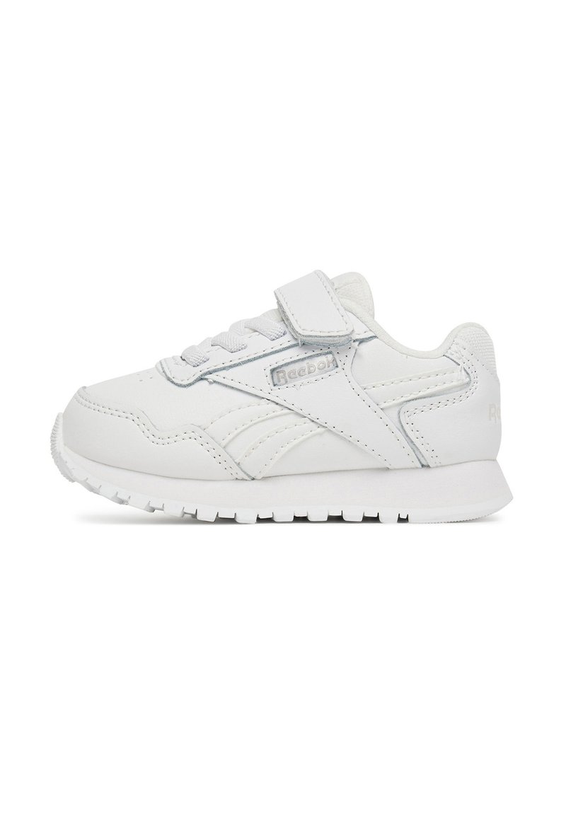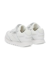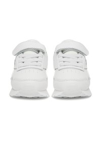 Valged Reeboki tossud, millel on siledast nahast pealispind, paela- ja takjapaelasulgur, ümara kujuga ninaosa ning tekstuuriga valge kummist tallaosa.