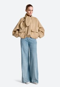 Naine beežika suurte krae- ja esitaskutega üle suuruses jopet ning helesiniseid teksapükse kandes, seisab külje peal.