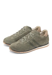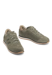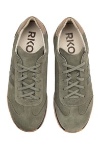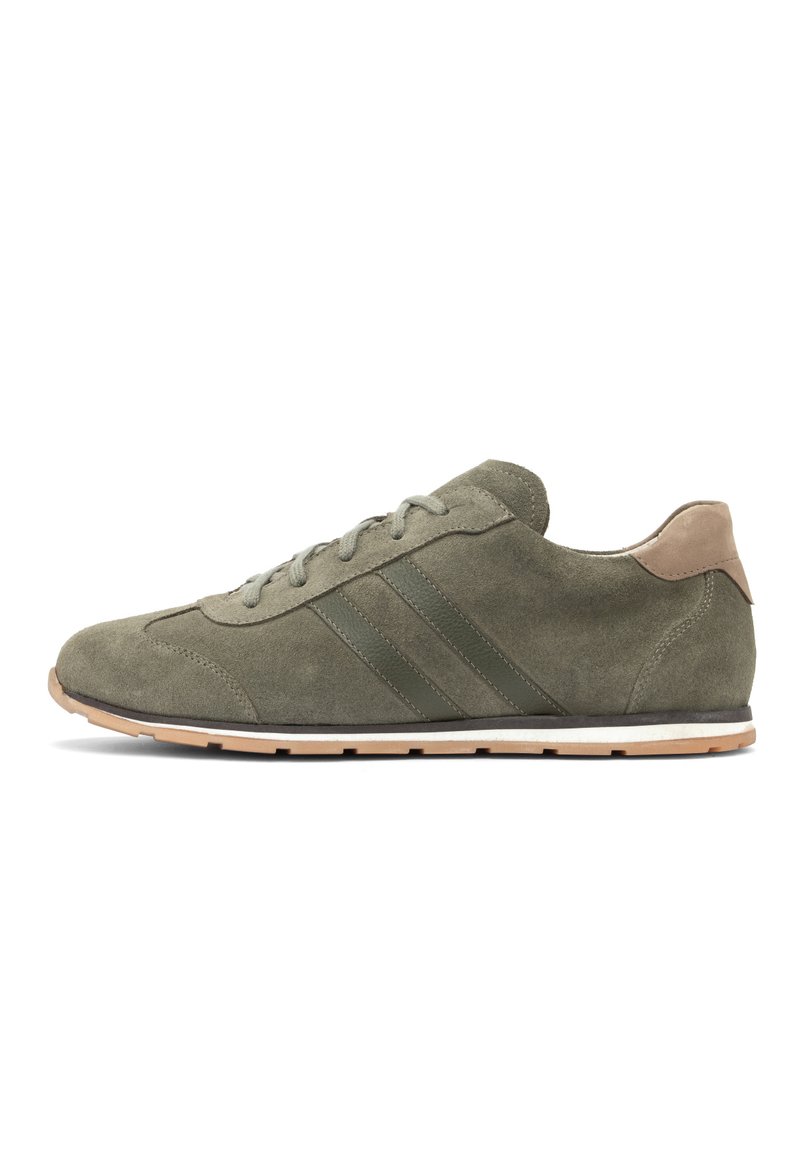 Olivroheline seemisnahast tennisking, esisuurtega, toon-trooniliste külgtriipudega, beež kannaosaga ja helepruuni kummipõhjaga.