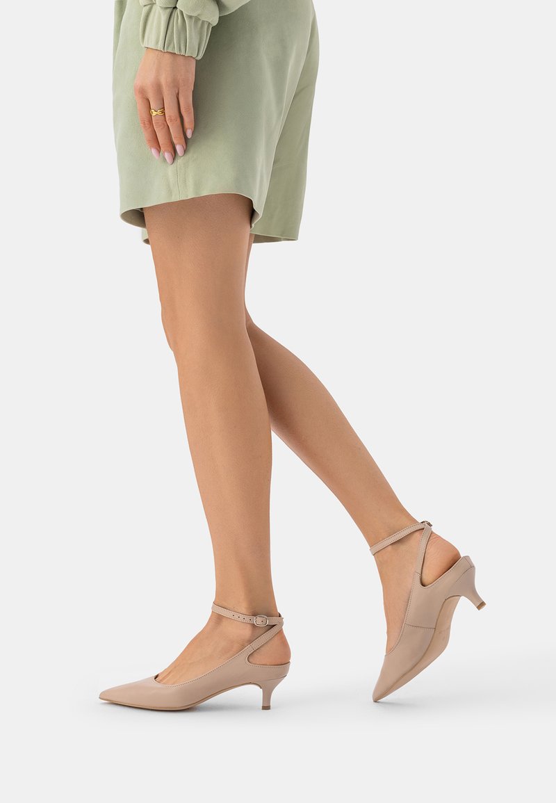 Naine, kes kannab beežikaid madala kontsaga teravnurkseid jalanõusid pahkluudest rihmadega, kombineeritud salvei rohelistest lühikestest pükstest ja sobiva pikkade varrukatega ülaosaga.