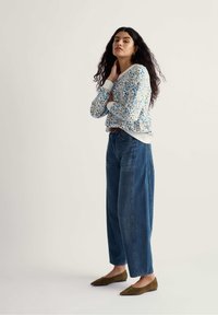 Naine, kellel on pikad lokkis juuksed, kannab valget lillemustriga pika varrukaga särki, mis on toppitud kõrge vöökohaga sinistesse teksadesse koos pruuni kootud vööga.