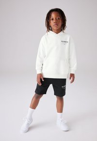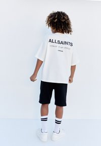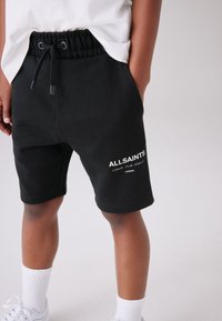 Laps mustas nööriga lühikestes pükstes, mille peal on "ALLSAINTS" logo, valges t-särgis, valgetes sokkides ja valgetes spordijalatsites, tavalise tausta ees.