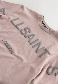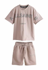 Hele roosa puuvillane T-särkide ja lühikeste pükste komplekt, millel on reljeefsete tähtedega trükitud "ALLSAINTS" ja "LONDON". Pehme kangas ja elastse vöökohaga.