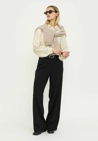 Kreemikas pluus kraega, tekstureeritud kangast ja volditud detailidega varrukatel, kombineeritud kõrge vöökohaga mustade pükstega ja musta vööga.