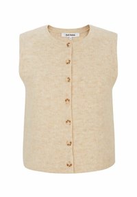 Tikitud türkiissinine vest ümarate kaelusega ja esiküljel nööpidega, kantud hele sinise tekstuurse pika varrukaga särgi peal; kreemjad püksid.