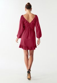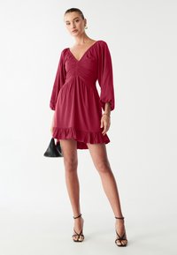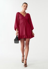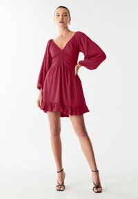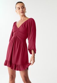 Punane kleit sügava V-kaelusega, muldjate kehaga ja puffigt varrukatega. Omab volangidega äärega ja pehmet, siledat kangast tekstuuri.