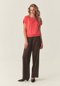 Naine laineliste blondide juustega, seljas korallikarva lühikeste varrukatega top lillelise tikandiga ja tumedat pruunikat volditud pükse kandes, poseerib käed taskutes.