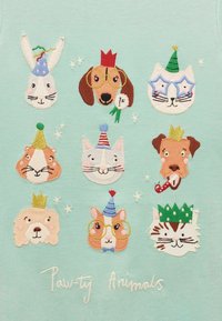 Hele-roheline laste T-särk, millel on üheksa värvikat loomade nägu, kes kannavad pidumütse ja kroone, all kiri "Paw-ty Animals".
