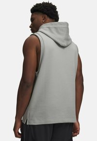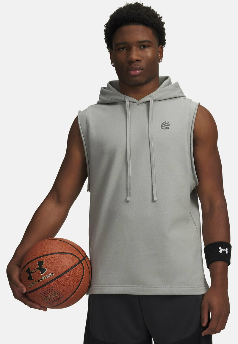 Hall värviga varrukateta kapuutsiga dressipluus, millel on esitasku, paeltega kapuuts ja rinnal logo, koos korvpalli ja musta randmerihmaga.