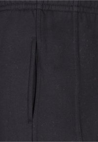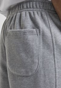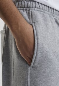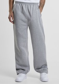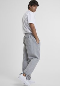 Mees, kes kannab lahtisi halli dressipükse elastsete varrukatega ja valgeid tossusid, seisab lihtsa tausta ees.