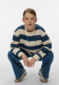 Noor inimene, kes kannab sinise ja beežide triipudega kampsunit, lahtisi siniseid pükse ja valgeid tossusid, poseerides käed pea taga tõstetud.