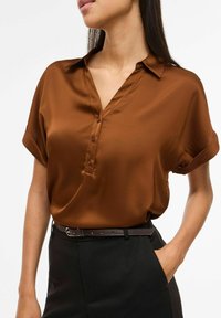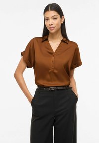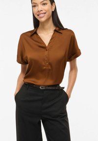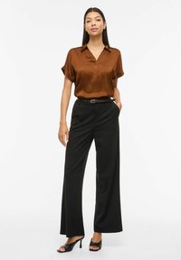 Pikkade juustega naine, kes kannab pruuni lühikeste varrukatega nööbitavat särke, mis on nööpidega kinni ja tagant mustade pükste sisse toppitud, ning musta vööd, seistes käed taskutes.