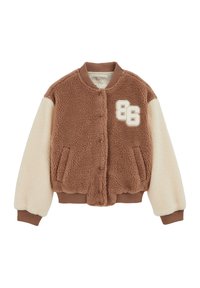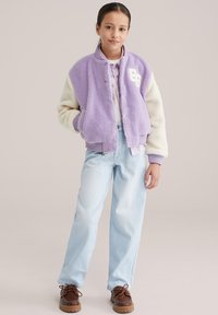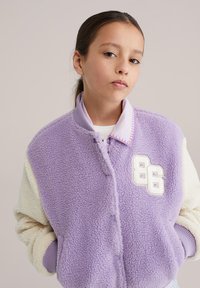 Lavendelset ja kreemikat tooni fliisist bomber-jakk, millel on ees tõmblukk, soonikkoes mansetid ja valge numbrimärk. Kombineeritud helesiniste teksade ja pruunide kingadega.