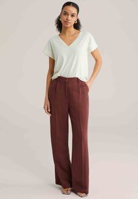 Noor juustega noor naine, kes kannab valget V-kaelusega lühikeste varrukatega topi ja roostekarva kõrge vöökohaga pükse, käed taskutes.