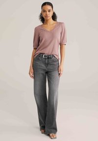 Naisel lokkis hobusesabaga, kes kannab lilla tekstuuriga V-kaelusega toppi, millel on pritsitud varrukad, mustad naelutatud vööd ja hallid teksad, käed selja taga.