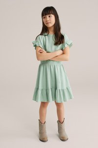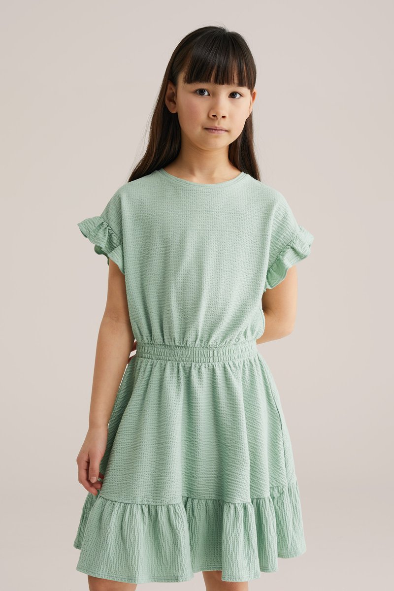 Pikkade tumedate juustega tüdruk, kes kannab tekstuurse helerohelise triiksärkiga kleiti, millel on volangidega varrukad ja serv, seisab ühevärvilise taustaga.