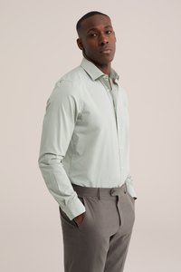 Mees kannab heledat rohelist nööpidega särki ja halli pükse, seisab käed taskutes ühevärvilise tausta ees.
