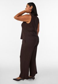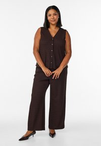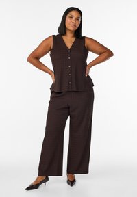 Naine seisab, seljas varrukateta pruun ees nööbitav top, sobivad laia säärega püksid ja mustad terava ninaga kontsakingad, valgel taustal.
